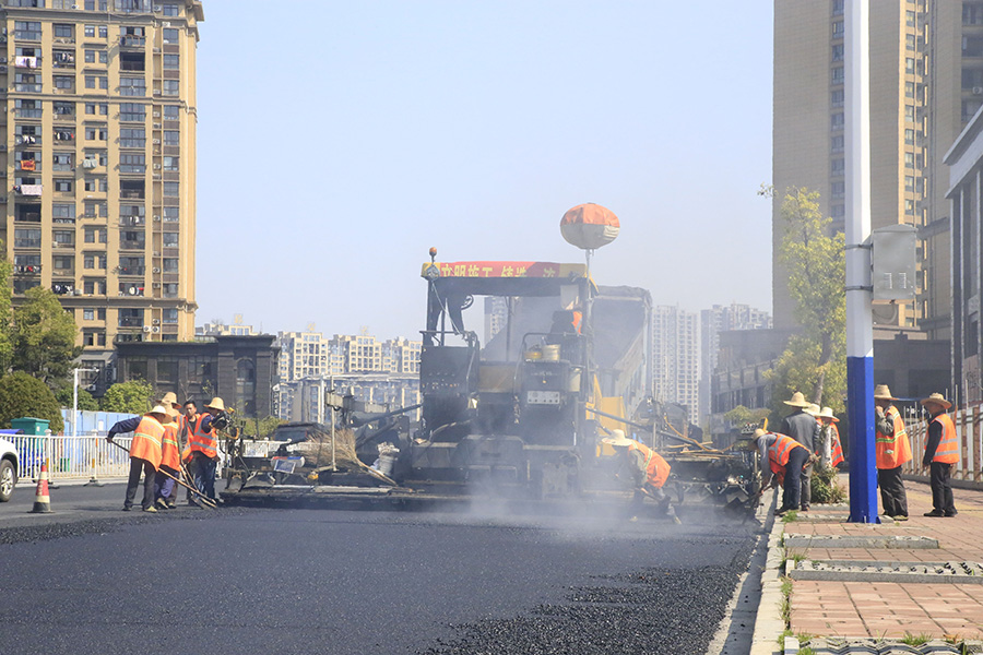 2019年8月,宜春經(jīng)開區(qū)S311路面攤鋪現(xiàn)場(chǎng),工友們輔助路面兩側(cè)的分料、補(bǔ)窩等作業(yè)